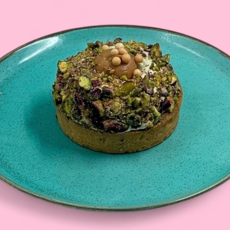 Τραγανή τάρτα φιστικιού με χειροποίητη πραλίνα φιστίκι, creme salty caramel, μους φιστίκι & σπασμένα φιστίκια Αιγίνης