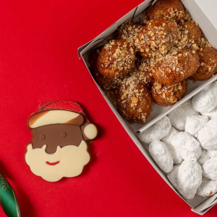 500gr μελομακάρονα με βιολογικό μέλι & καρύδι και 500gr κουραμπιέδες με φρέσκο βούτυρο & αμύγδαλο & ένα chocolate tree ή chocolate santa (κατόπιν διαθεσιμότητας).